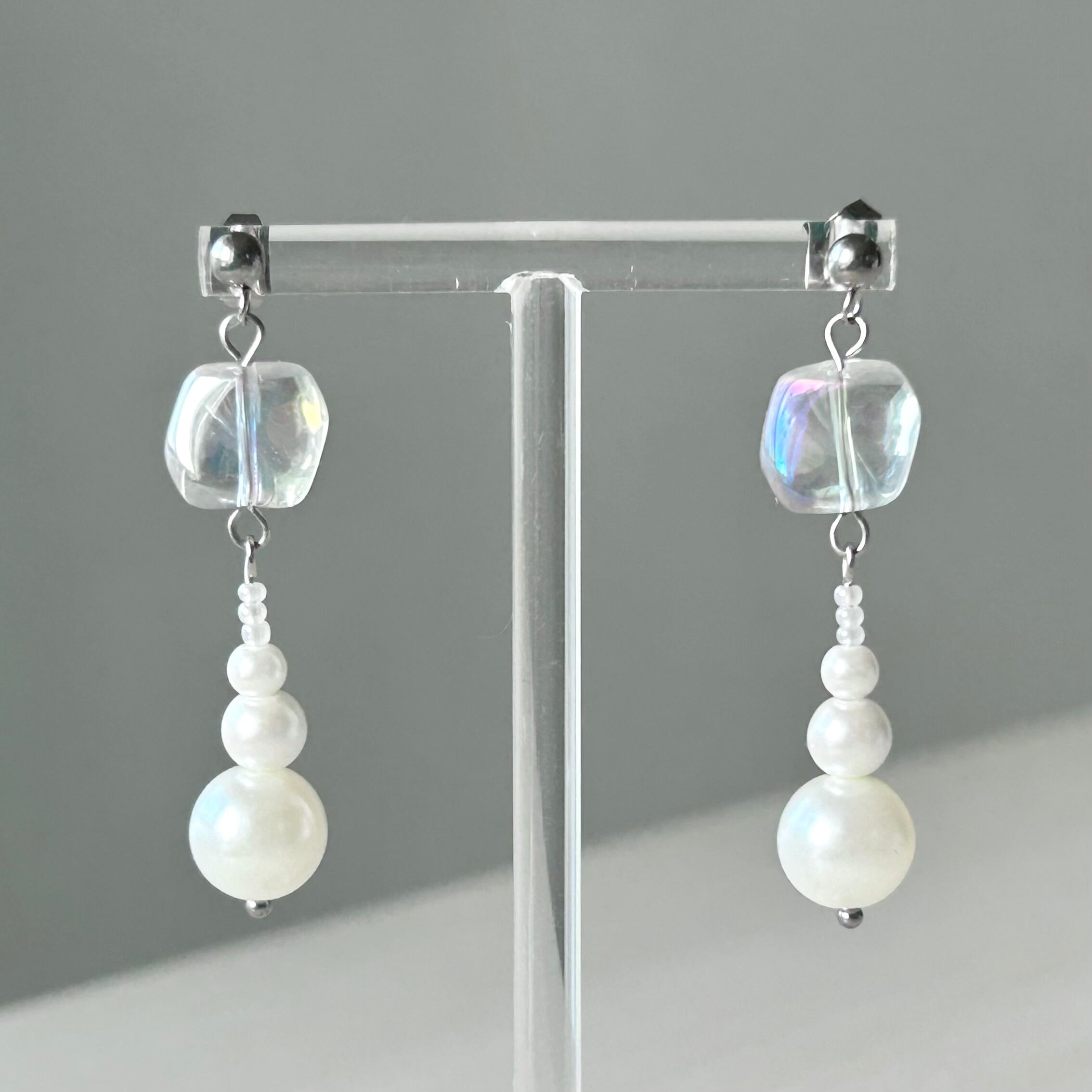パールとオーロラガラスビーズのシンプルなピアスです。