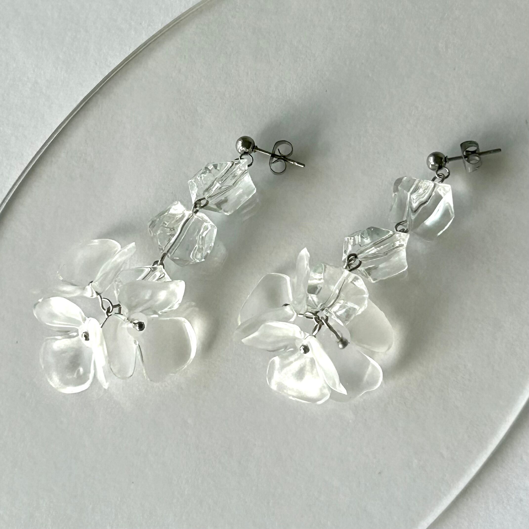 スっと透き通る儚げな花のモチーフが揺れる、クリアなのに存在感のあるピアスです。